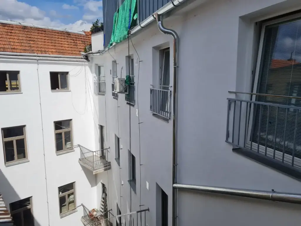 - Montáž okapových žlabů a svodů: Nové okapové systémy jsou instalovány s cílem optimalizovat odvodnění a chránit fasádu před vodními škodami.