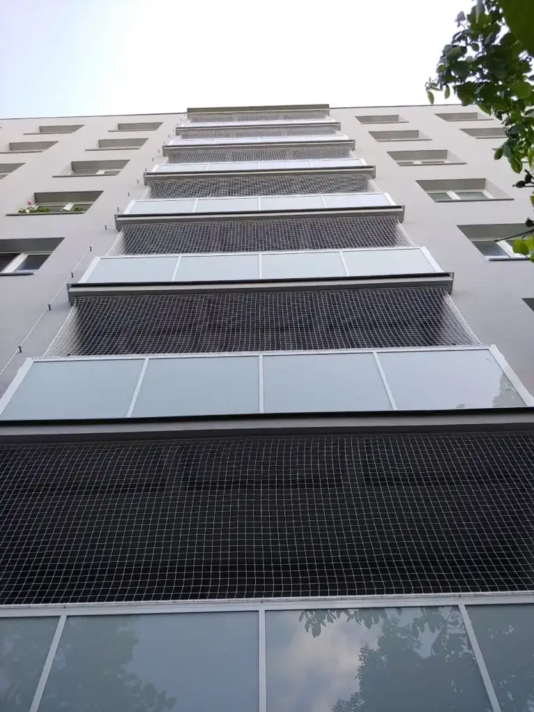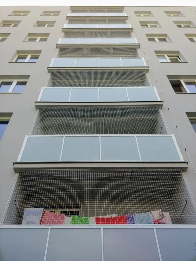 Hroty proti holubům pomáhají hlavně na atikách a nárožích budov, kam holubi s oblibou usedají. Na tomto bytovém domě v Novém Lískovci jsme nainstalovali nerezové hroty proti holubům. Dále pak od nás zákazník požadoval montáž sítí proti holubům do společných lodžií. Při montáži jsme využili kvalitní PA sítě s vysokou UV životností. Holubi si tak museli najít jiné místo k hnízdění.