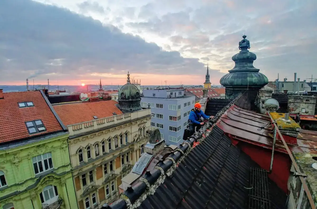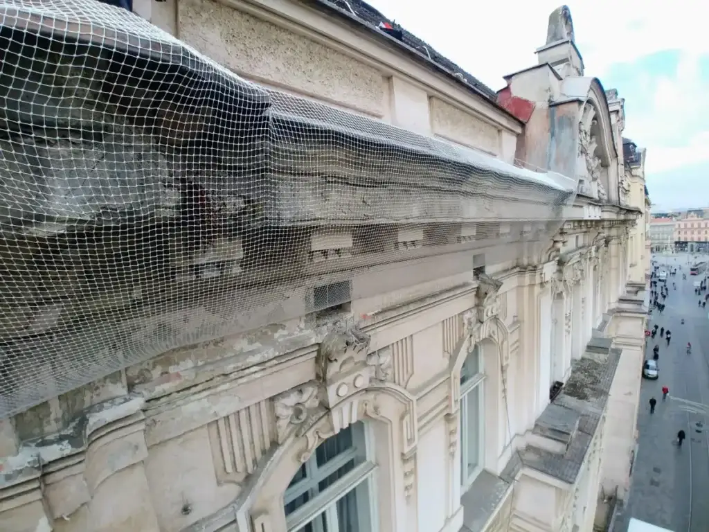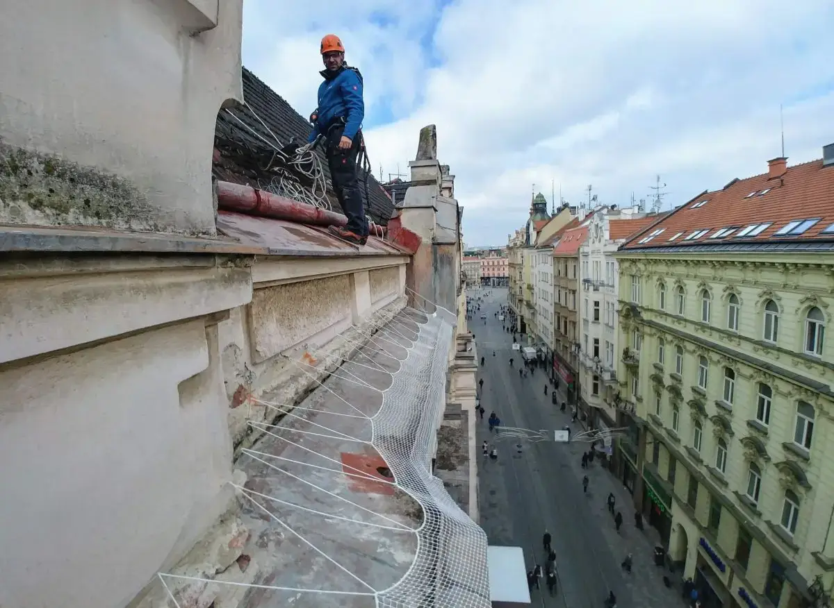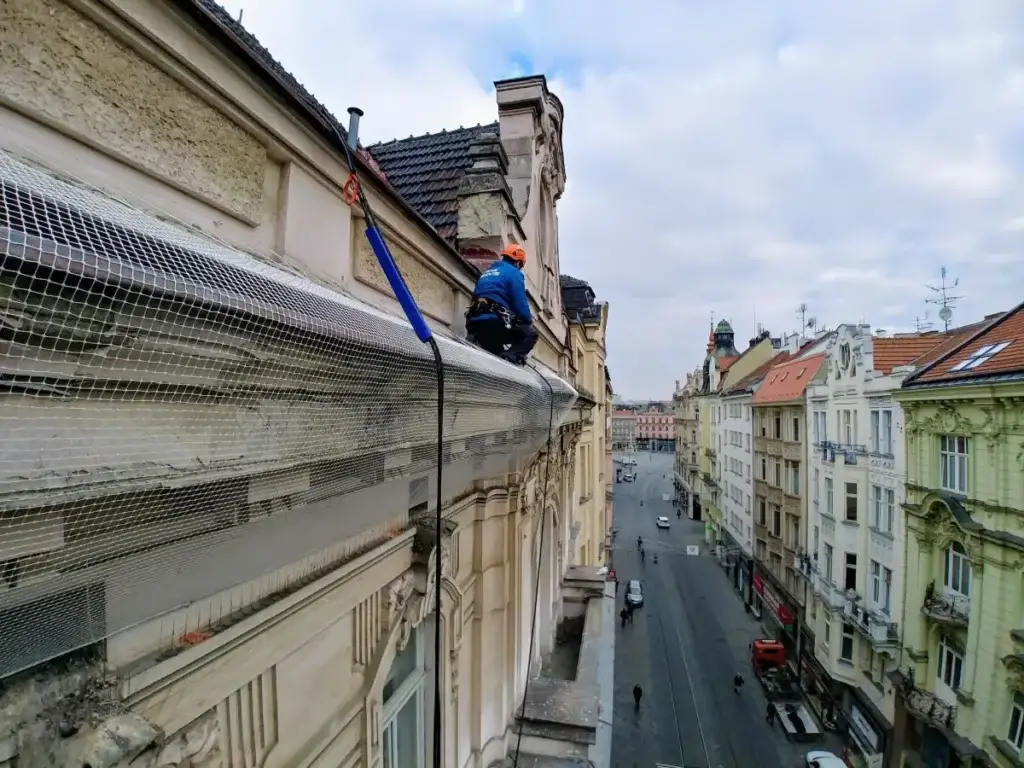 Lanový přístup umožňuje efektivní instalaci bezpečnostních sítí na rizikové římsy, eliminuje nutnost těžké techniky a snižuje náklady.